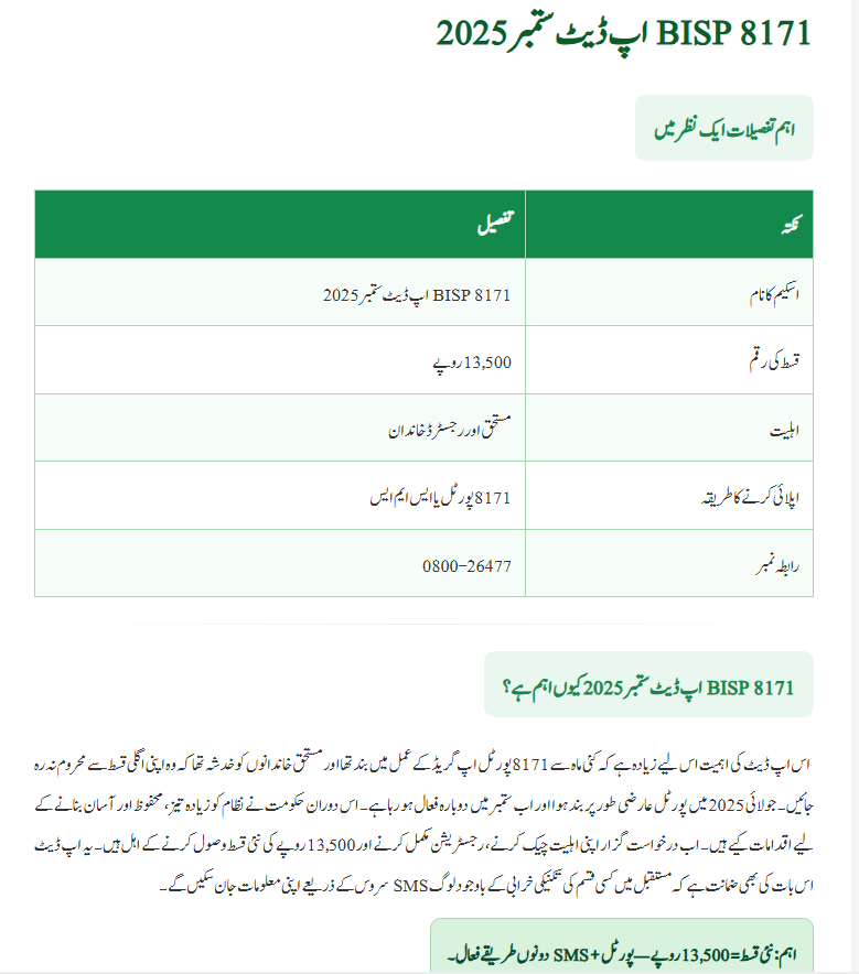 The BISP 8171 Update September 2025 is a major step by the government of Pakistan to provide timely support to deserving families. Through this update, millions will receive Rs 13,500 transparently and efficiently. With both the portal and SMS options, checking eligibility has become easier than ever. If you haven’t registered yet, do it now, update your CNIC, and keep your documents ready. This installment is not just financial help—it’s a lifeline for families struggling with rising costs of living.