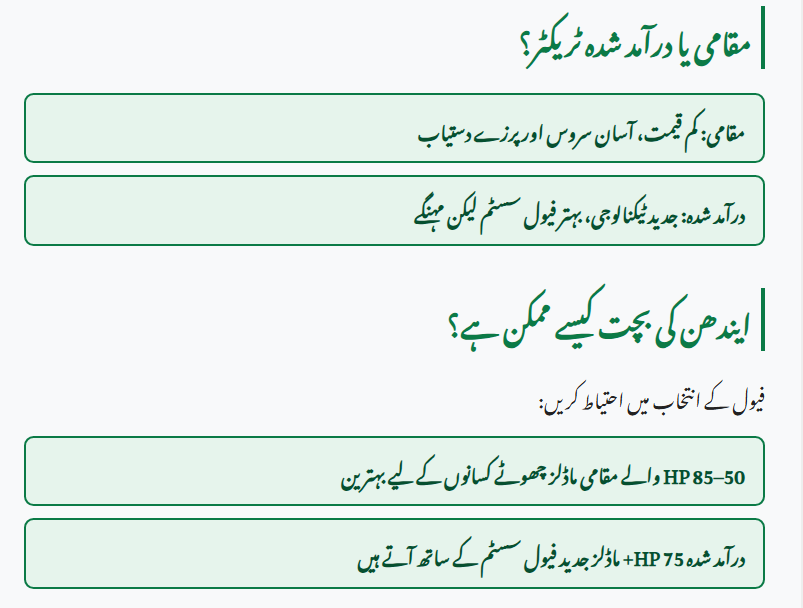 This is a common question. Local tractors are cheaper, with parts and services available everywhere, making them the go-to choice for most small and medium farmers. Imported tractors, on the other hand, come with modern technology, comfort features, and better fuel management — but they’re more expensive, and spare parts can be costly. If you’re applying for the 75 HP+ subsidy (Rs. 1 million) and have access to service in your area, imported models can be a smart investment.