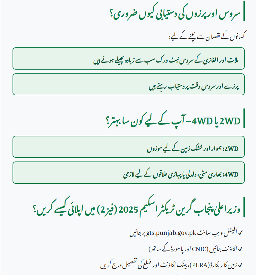 Successful farming means making smart choices at the right time. In 2025, the CM Punjab Green Tractor Scheme Phase 2 is a golden chance for farmers to buy the right tractor with government support. If you need a small tractor, the Rs. 500,000 subsidy will make it affordable. If you’re upgrading to a more powerful tractor, the Rs. 1 million subsidy can ease your investment. But remember — don’t overbuy horsepower you don’t need. Spend your savings on essential implements like planters, sprayers, or loaders that actually increase yield. By matching tractor power with your land size and soil type, you turn today’s subsidy into tomorrow’s productivity.