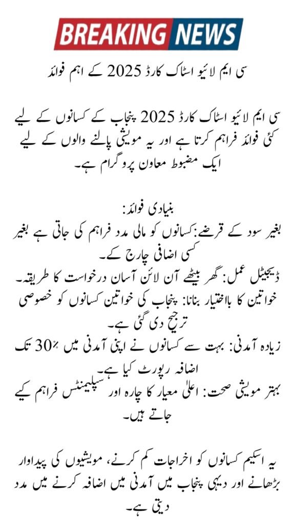 The CM Livestock Card 2025 is a Punjab farmers scheme that helps small and medium farmers access interest-free loans for livestock feed and supplies. The card is designed to promote better animal health, increase profits, and provide equal opportunities for women farmers in Punjab.
