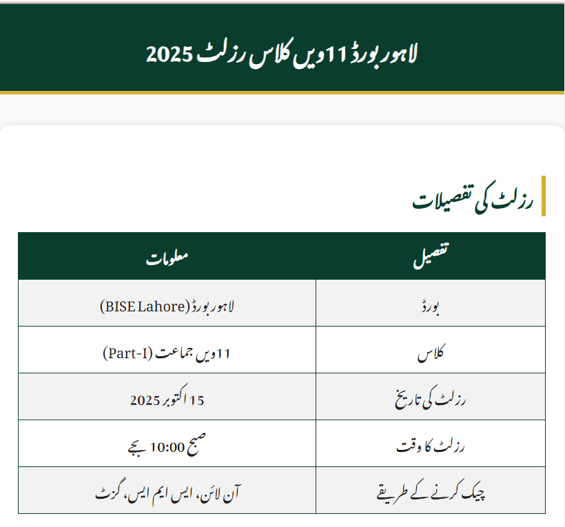 The Board of Intermediate and Secondary Education (BISE) Lahore has officially announced that the Lahore Board 11th Class Result 2025 will be declared on 15th October 2025 at 10:00 AM. Students are advised to keep their roll number slips ready before the result day to avoid any last-minute issues. If you don’t have access to the internet, don’t worry — the board has provided three easy ways to check your result, which are explained below.