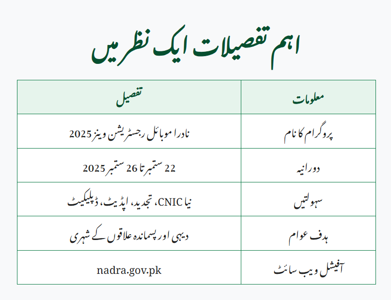 According to NADRA, mobile vans will visit different rural areas from 22nd to 26th September 2025. The tentative schedule is: