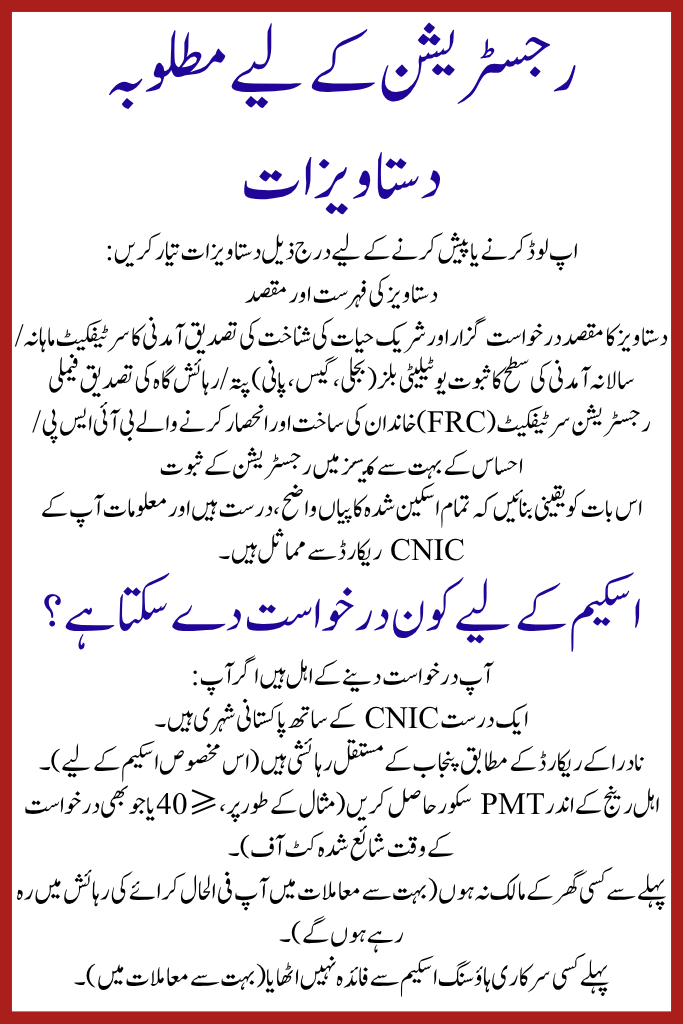 While some older information referenced a PMT ≤ 60 for eligibility in certain schemes. For the present stage of Apni Chhat Apna Ghar, the emphasis has remained on families with inferior scores. Also, recipients of BISP and Ehsaas Programme are often considered eligible mechanically since they characteristically fall in the lower notch variety.