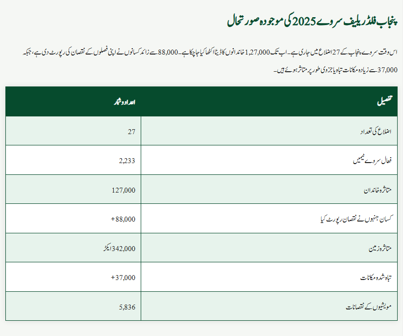 The Punjab Flood Relief Survey 2025 is currently in progress across 27 districts. More than 127,000 families have already been surveyed. Around 88,000 farmers have reported crop losses, while 37,000 homes have been recorded as damaged or destroyed.