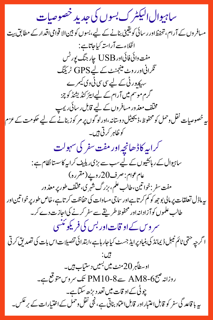 The scheme is designed not only for affordability but also for environmental sustainability, social inclusion, and urban development. For the first time, Sahiwal residents determination enjoy an prearranged bus system by fixed fares, free rides for certain groups, and international-level facilities.