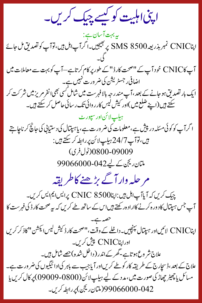 This means if you are living in any of these districts – Multan, Lodhran, Khanewal or Vehari – and you hold a CNIC, you can access free treatment at these hospitals under the programme.